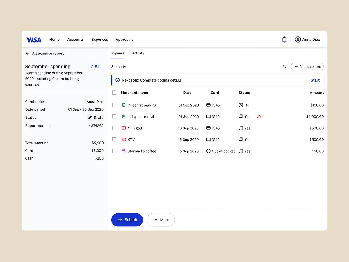 Designed and launched a corporate expense platform for major financial institutions including Visa and Wells Fargo, serving 50,000+ cardholders and 3,000+ managers. User testing showed 85% reduction in expense submission time and 92% first-time approval rate, transforming a painful monthly task into a seamless experience.